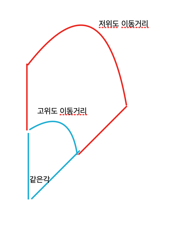 시각적으로 위 그림과 같다고 이해하시면 됩니다 같은 시간동안 같은 각을 이동했어도 저위도는 반경이 길이서 먼 거리를 이동하게 되고