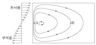 오 해류, 북태평양 해류, 그외 심층 순환등) 대기는 위도 0~30도 지역에서 흐르는 해들리 순환(무역풍, 동에서 서로 붑니다) 45~60도에서 부는 페렐순환(편서풍, 서에서 동으로 붑니다) 극동풍 등