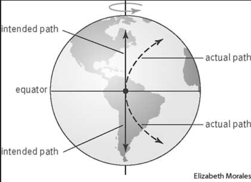 지금 물체의 회전속도(적도에서의 땅의회전속력과 같은)는 고위도 땅의 회전속도보다 훨씬 빠르므로 물체는 오른쪽으로 치우쳐지게 됩니다