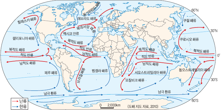 때문에 이러한 열에너지를 지구 곳곳으로 순환시키는 것입니다. 그 중에서 해양은 해류를 통해 수송하고 (남극 순환 해류,북적도해류,쿠로시